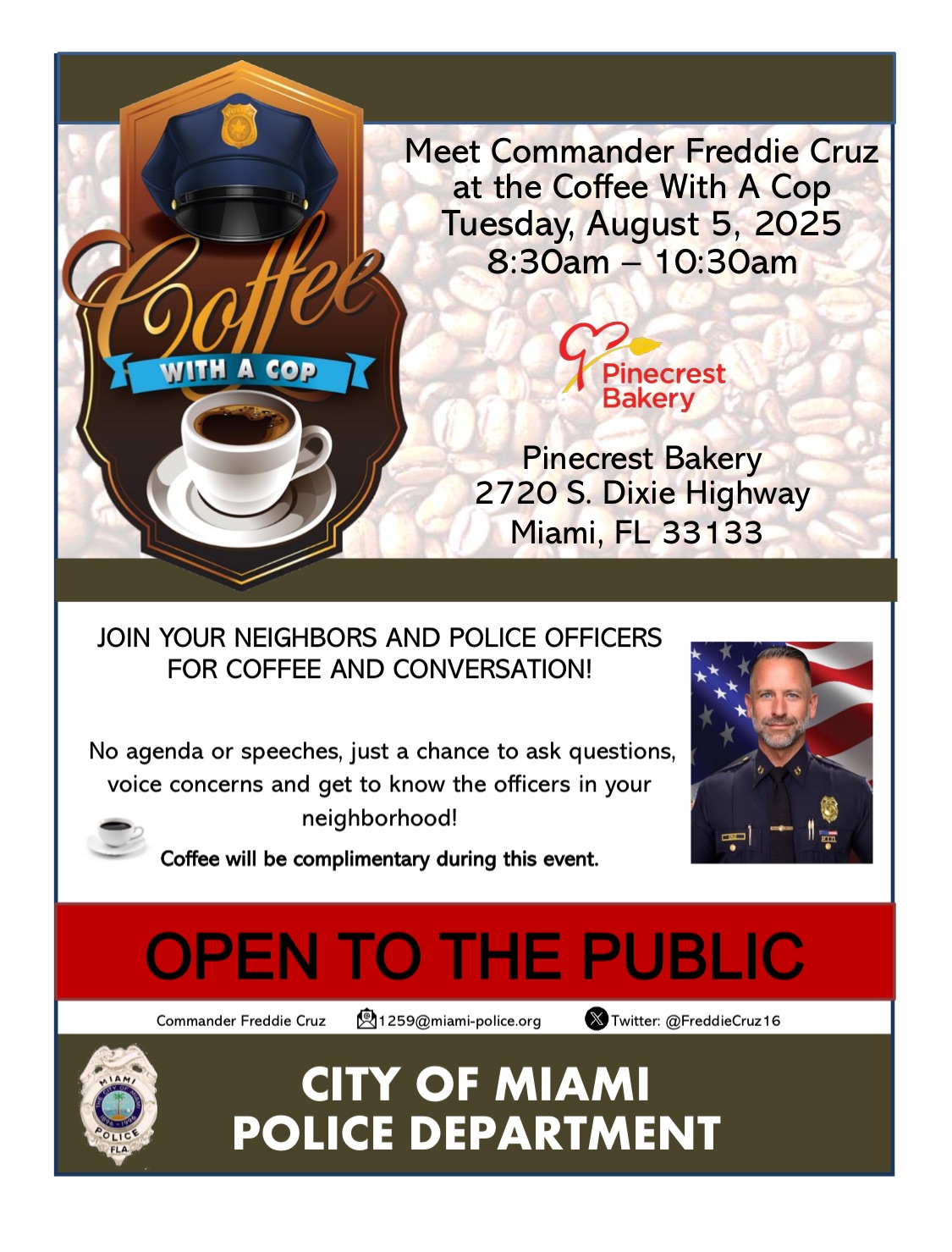 Meet Commander Freddie Cruz at the Coffee with a COP on Tuesday, August 5, 2025 at 8:30 a.m. See flyer for more details