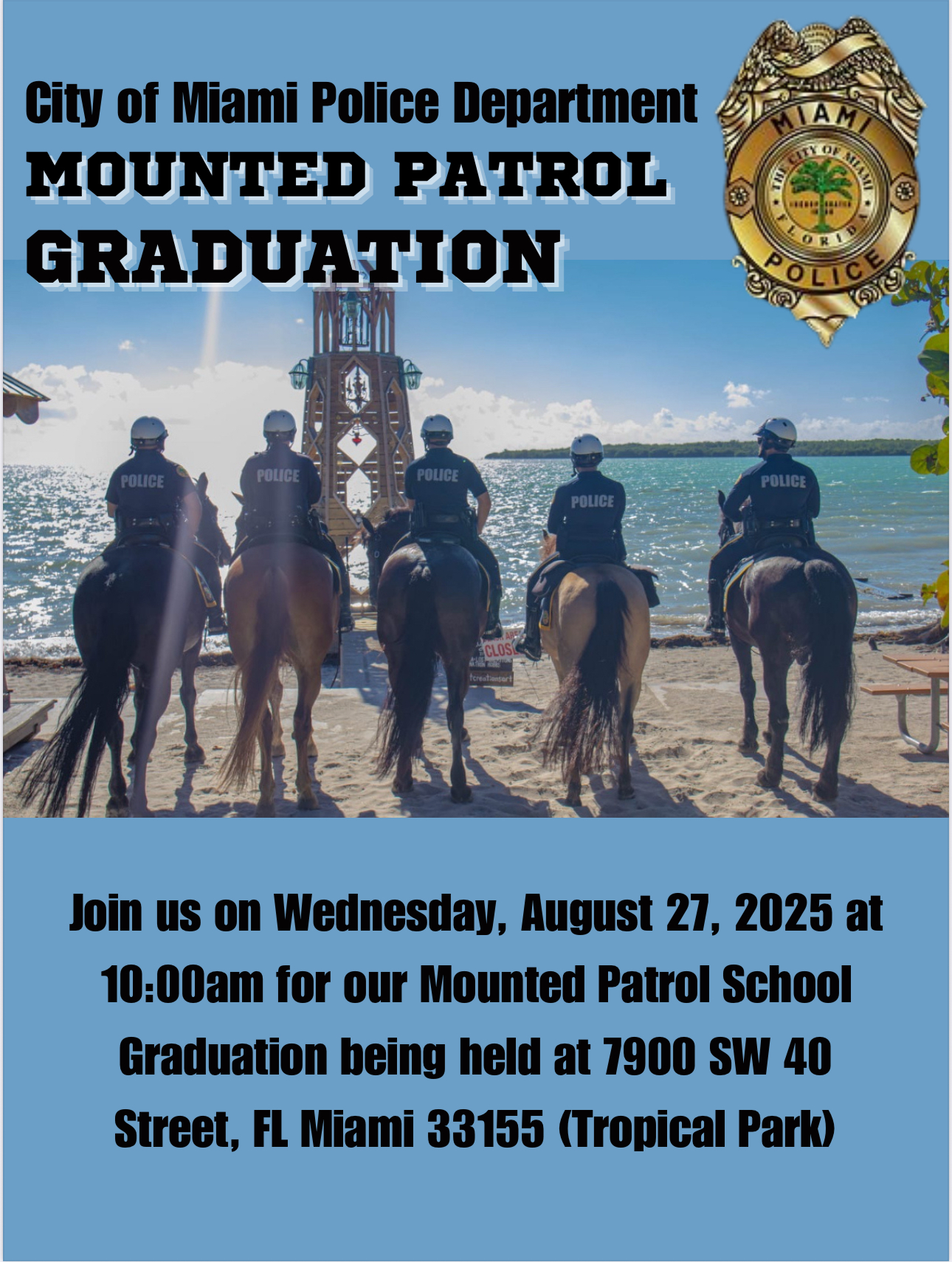 Join us on Wednesday, August 27th, 2025 at 10:00 am for our Mounted Patrol School Graduation.