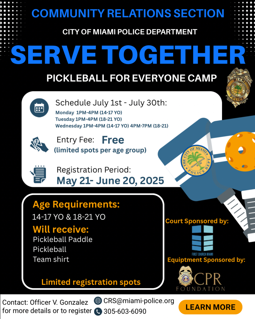 Serve together - Pickleball camp Contact Officer V. Gonzalez for more details or to register: 📧CRS@miami-police.org ✆ 305-603-6090
